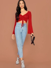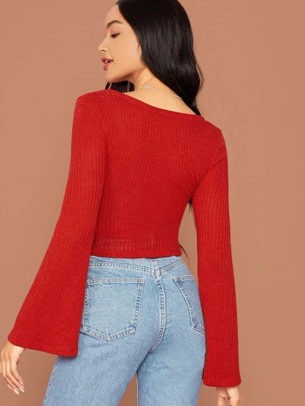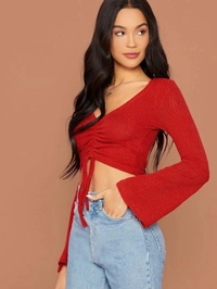 Bell Sleeve Drawstring Ruched Front Ribbed Tee
