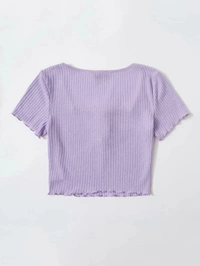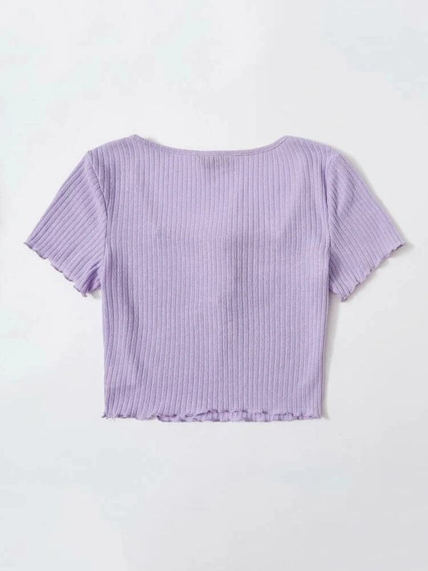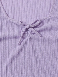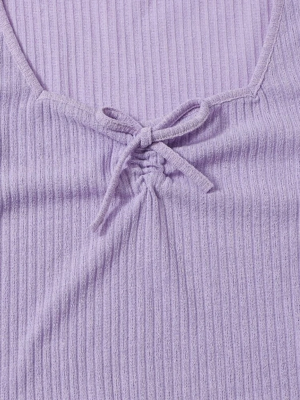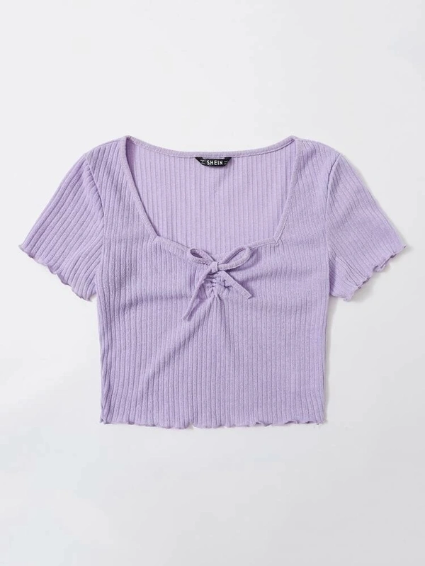 Drawstring Front Lettuce Edge Rib-Knit Tee