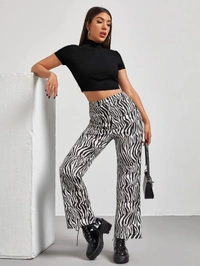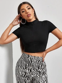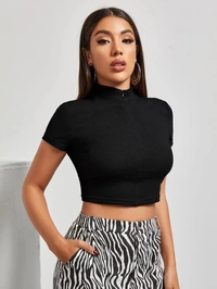 Mock-Neck Zip Half Placket Rib-Knit Top